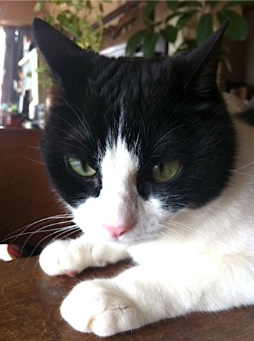 瞳の色が違うけど、このはちわれの模様といいピンクの鼻といい、何だか似てません?